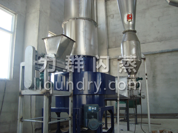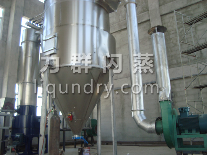 由于该产品的颗粒度要求在20-80目左右所以闪蒸干燥机的粉碎部分要做相应的调整,不能采用传统的结构而且传动电机的功率和转速需采用变频或调速仪控制。整套设备的进风温度控制在150-160℃,出风温度控制在70℃左右。物料有一定的粘性加料部分需采用双螺旋加料机,整套设备在调试过程中一次性试车成功,一切技术要求全部达到设备运行稳定。
