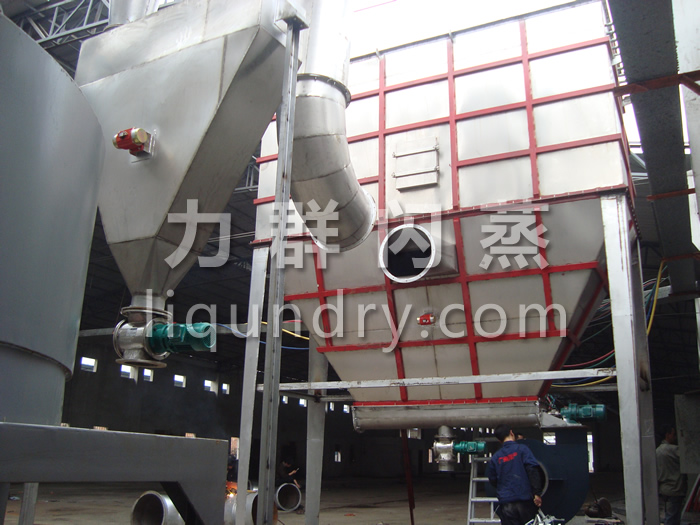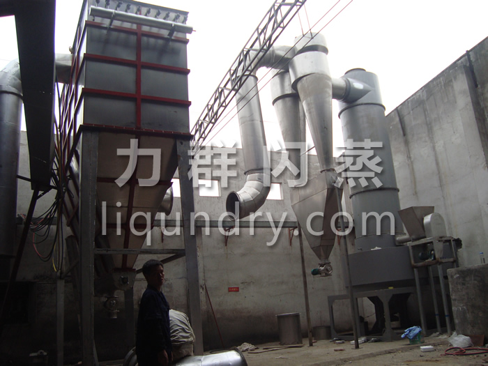 经换热器加热后的洁净空气被鼓入进风口,以适宜的速度旋入干燥室底部的环隙,然后按切线方向进入干燥室,并呈螺旋状上升:同时,物料则由可无级调速的加料器定量加入塔内。在干燥塔内,物料与热空气进行充分、高效的质热变换,被干燥的粉状物料随同热风一起输送至分离器,其中成品收集包装,而尾气则进一步经除尘装置处理后排空。