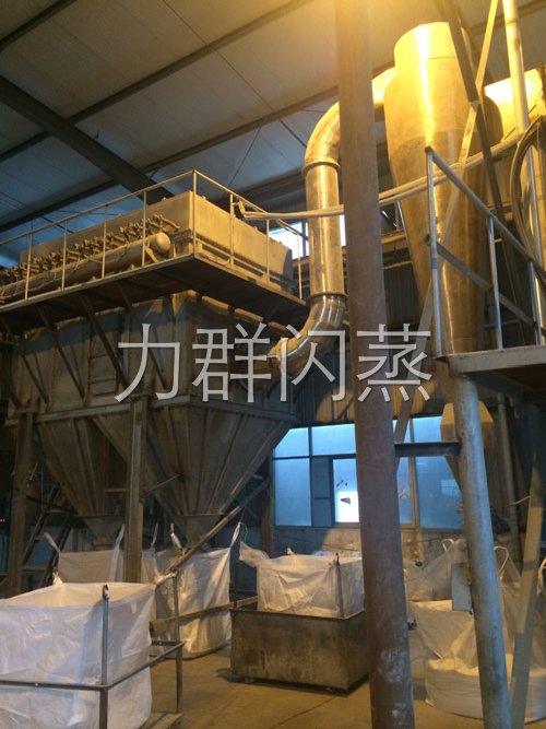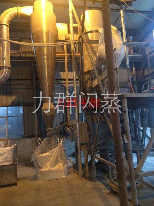 经换热器加热后的洁净空气被鼓入进风口,以适宜的速度旋入干燥室底部的环隙,然后按切线方向进入干燥室,并呈螺旋状上升:同时,物料则由可无级调速的加料器定量加入塔内。在干燥塔内,物料与热空气进行充分、高效的质热变换,被干燥的粉状物料随同热风一起输送至分离器,其中成品收集包装,而尾气则进一步经除尘装置处理后排空。